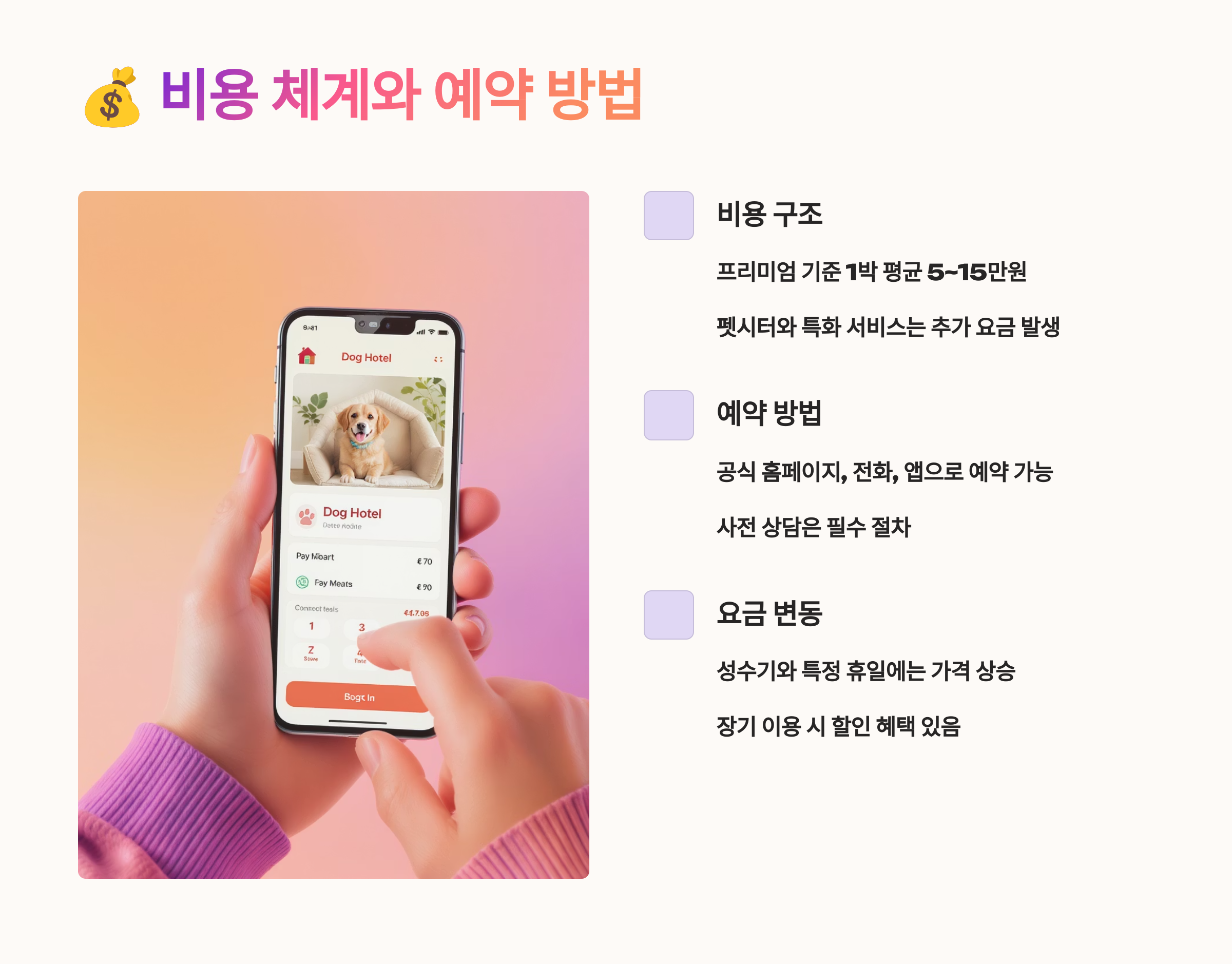 예약은 최소 2주 전에 하는 것을 추천해요. 특히 연휴나 휴가철에는 한 달 전에도 자리가 없을 수 있거든요. 저는 온라인으로 예약했는데, 강아지의 기본 정보(나이, 성별, 중성화 여부, 질병 이력 등)를 상세히 입력해야 했어요. 또한 예방접종 증명서와 함께 보호자 신분증 사본도 제출해야 했답니다.