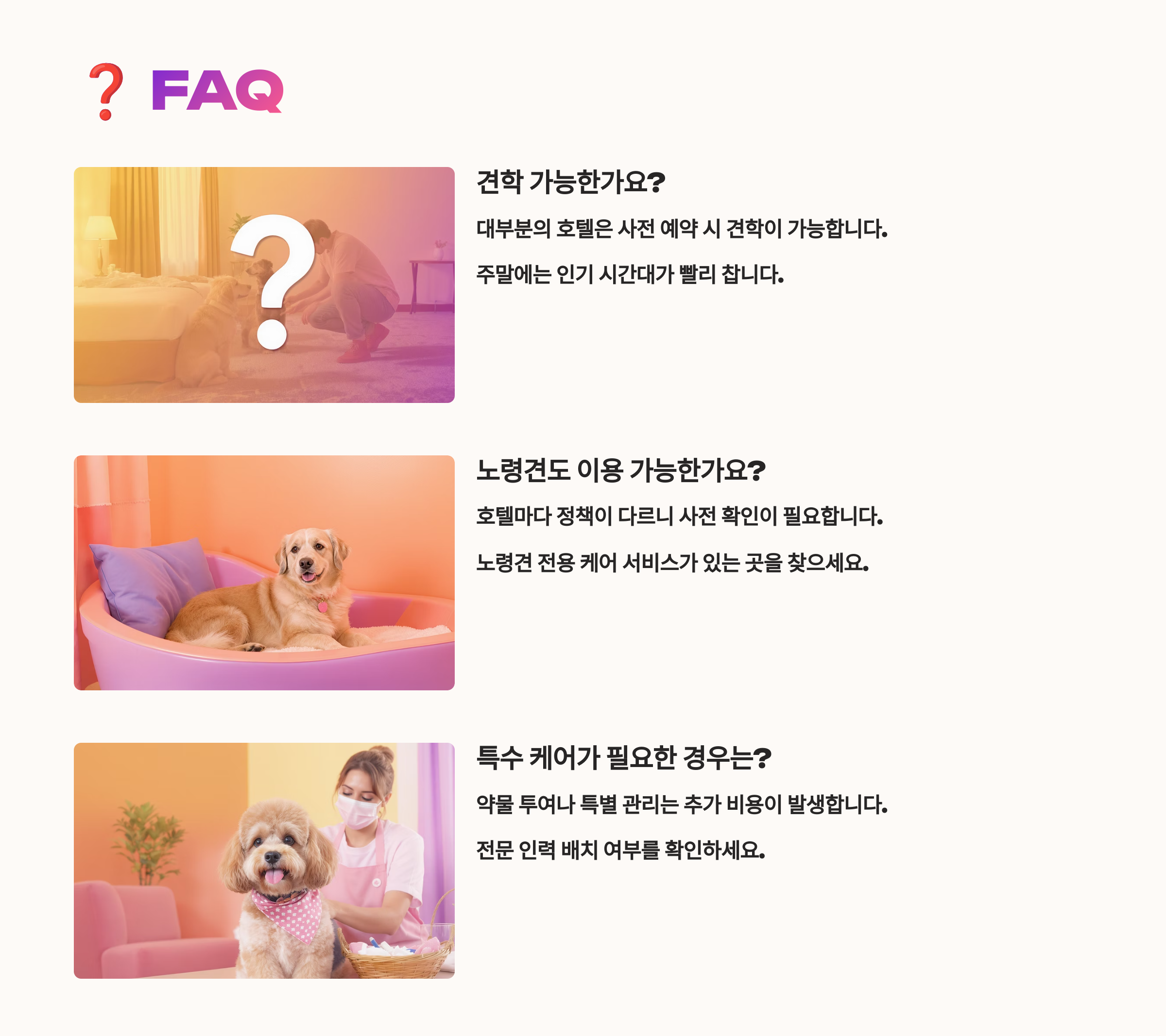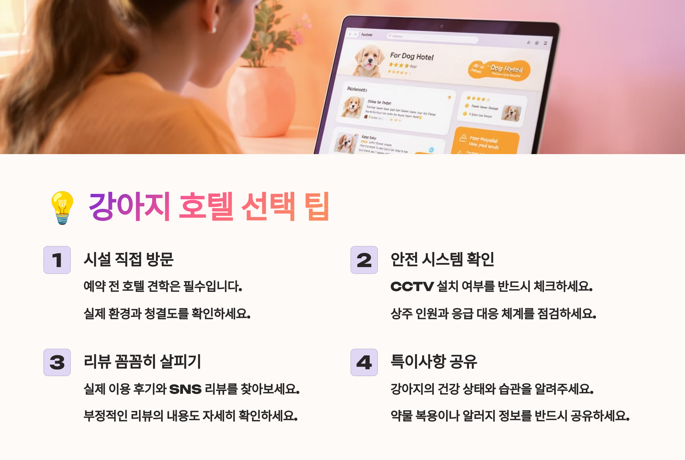 앞으로 강아지 호텔을 이용하실 분들께 드리고 싶은 조언은, 충분한 시간을 들여 신중하게 선택하라는 거예요. 우리 아이를 믿고 맡길 수 있는 곳인지, 시설과 서비스는 만족스러운지, 무엇보다 우리 강아지가 편안하게 지낼 수 있는 곳인지 꼼꼼히 확인해보세요.
