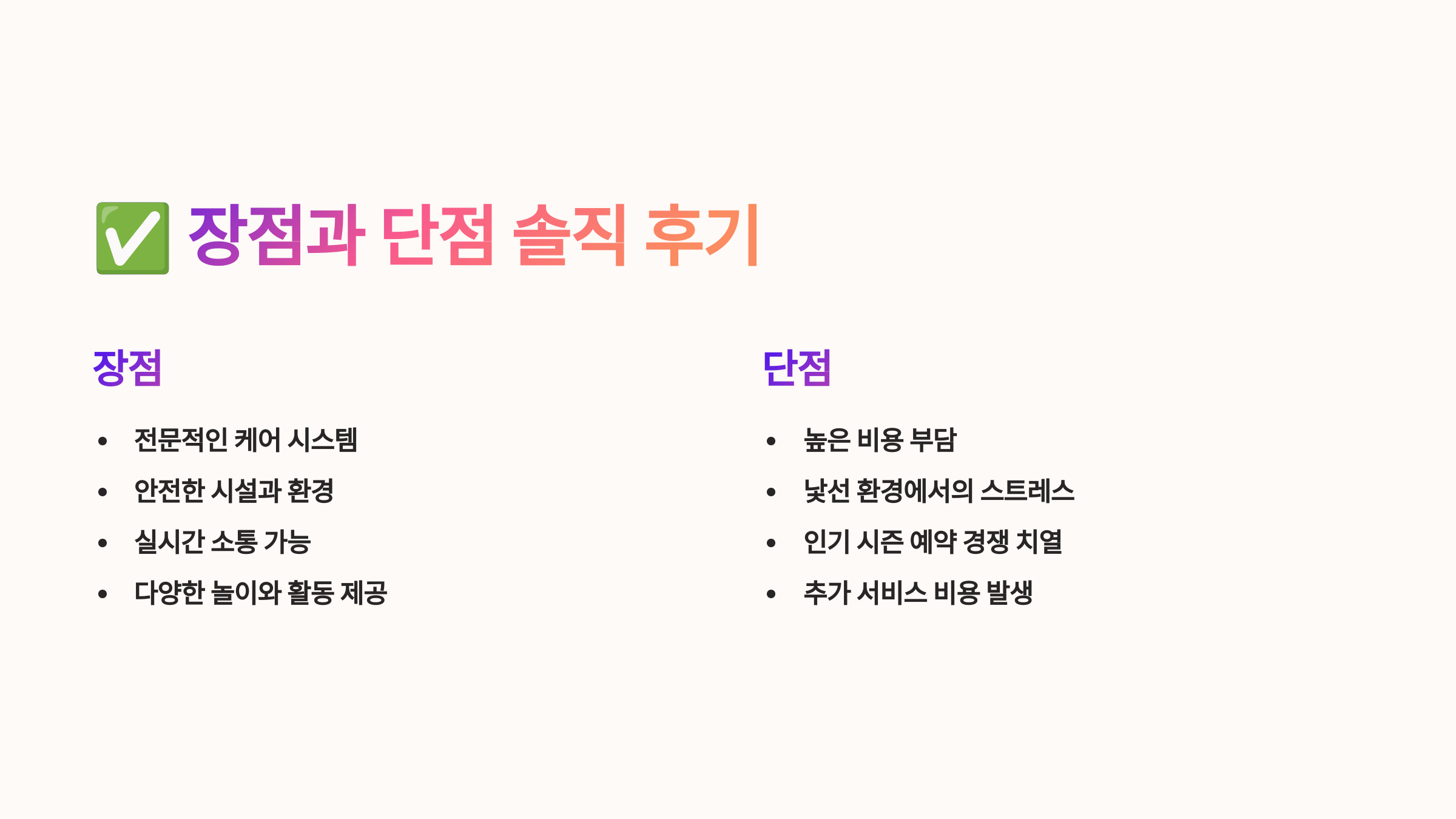 3박 4일간의 강아지 호텔 이용을 마치고 느낀 점들을 솔직하게 정리해보려고 해요. 먼저 장점부터 말씀드리면, 전문적인 케어 시스템이 정말 인상적이었어요. 24시간 관리 체계가 잘 갖춰져 있어서 안심하고 맡길 수 있었고, 직원들의 전문성도 뛰어났답니다.